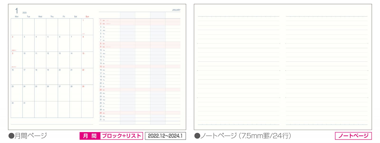 | 仕様・価格 | ■クォーター 品番:NS-A510-23 本体サイズ:ヨコ150×タテ217×厚み8mm 本体重量:204g メーカー希望小売価格:1,200円(税込1,320円) 本文:上質紙・128ページ 収録内容:年間カレンダー、イヤープラン、月間ページ(ブロック+リスト 2022.12〜2024.1 月曜始まり)、ノートページ(本文罫:7.5mm / 24行 97ページ収録) ■ハーフ 品番:NS-A511-23 本体サイズ:ヨコ150×タテ217×厚み12mm 本体重量:310g メーカー希望小売価格:1,400円(税込1,540円) 本文:上質紙・216ページ収録内容:年間カレンダー、イヤープラン、月間ページ(ブロック+リスト 2022.12〜2024.1 月曜始まり)、ノートページ(本文罫:7.5mm / 24行 185ページ収録) ■スタンダード 品番:NS-A512-23 本体サイズ:ヨコ150×タテ217×厚み21mm 本体重量:532g メーカー希望小売価格:1,800円(税込1,980円) 本文:上質紙・400ページ収録内容:年間カレンダー、イヤープラン月間ページ(ブロック+リスト 2022.12〜2024.1 月曜始まり)、ノートページ(本文罫:7.5mm / 24行 369ページ収録) |