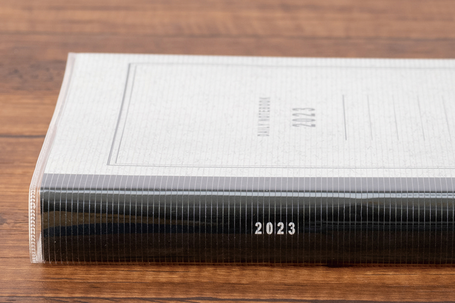 表紙デザインは、上品でトラディショナルな印象の毛入紙を採用。ライン入りの透明カバーを付属、ページ落ちの心配がない糸綴じ製本ですので、1年間安心してお使いいただけます。