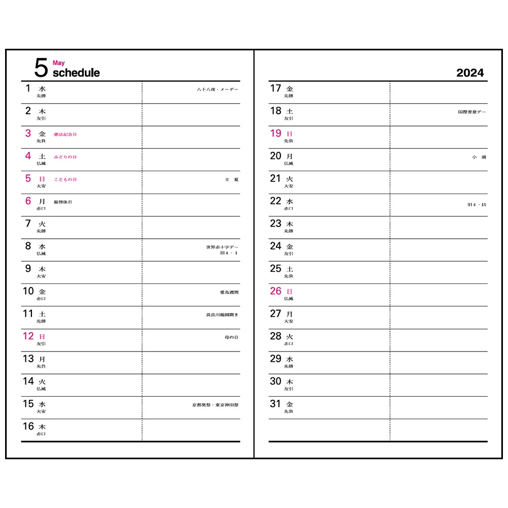 | 内容 | カレンダー、年間スケジュール、月間スケジュール(翌年4月まで)、週間スケジュール、ノート、別冊アドレス、おぼえ |