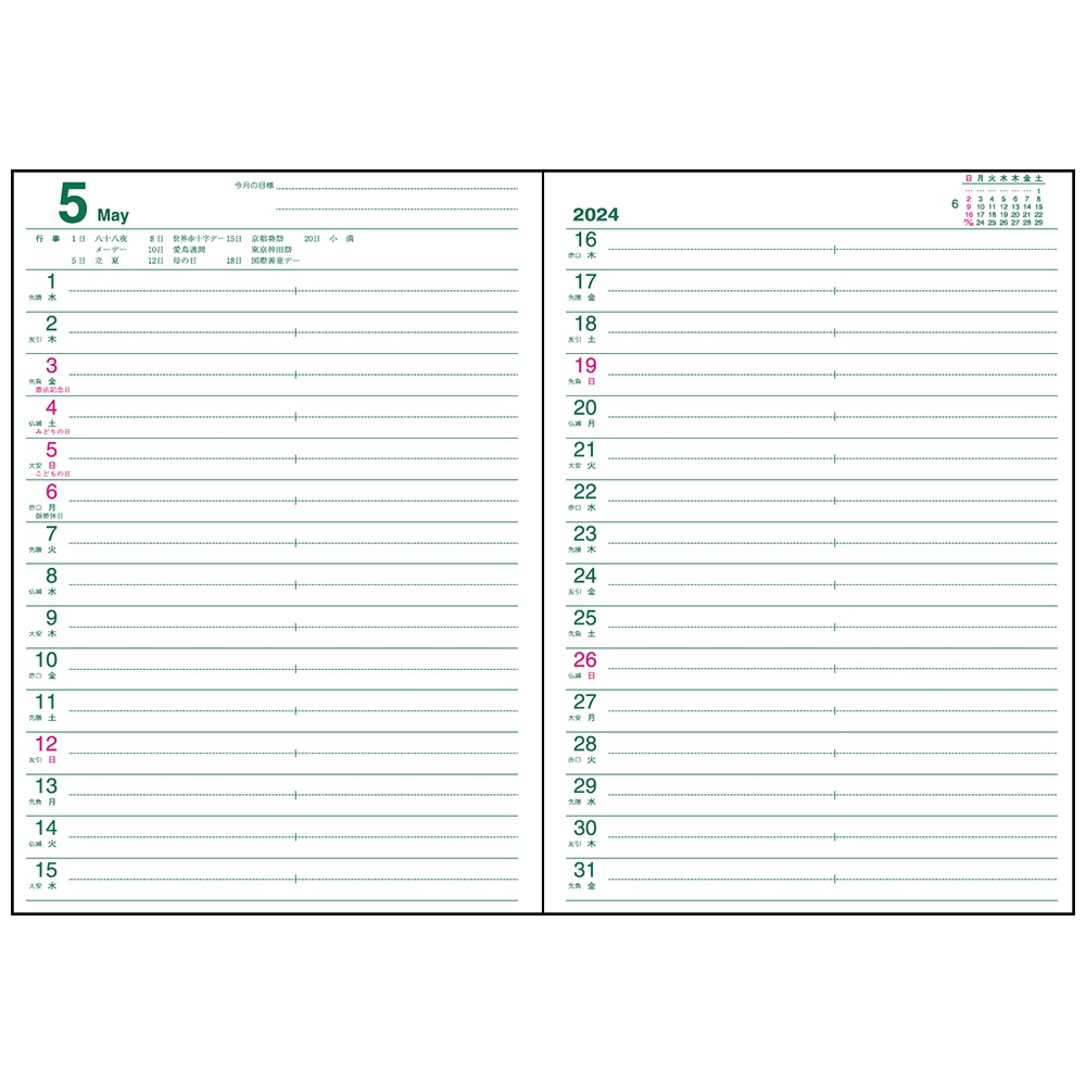 | 内容 | カレンダー、年間スケジュール、月間スケジュール(翌年4月まで)、ノート77頁、アドレス、おぼえ |