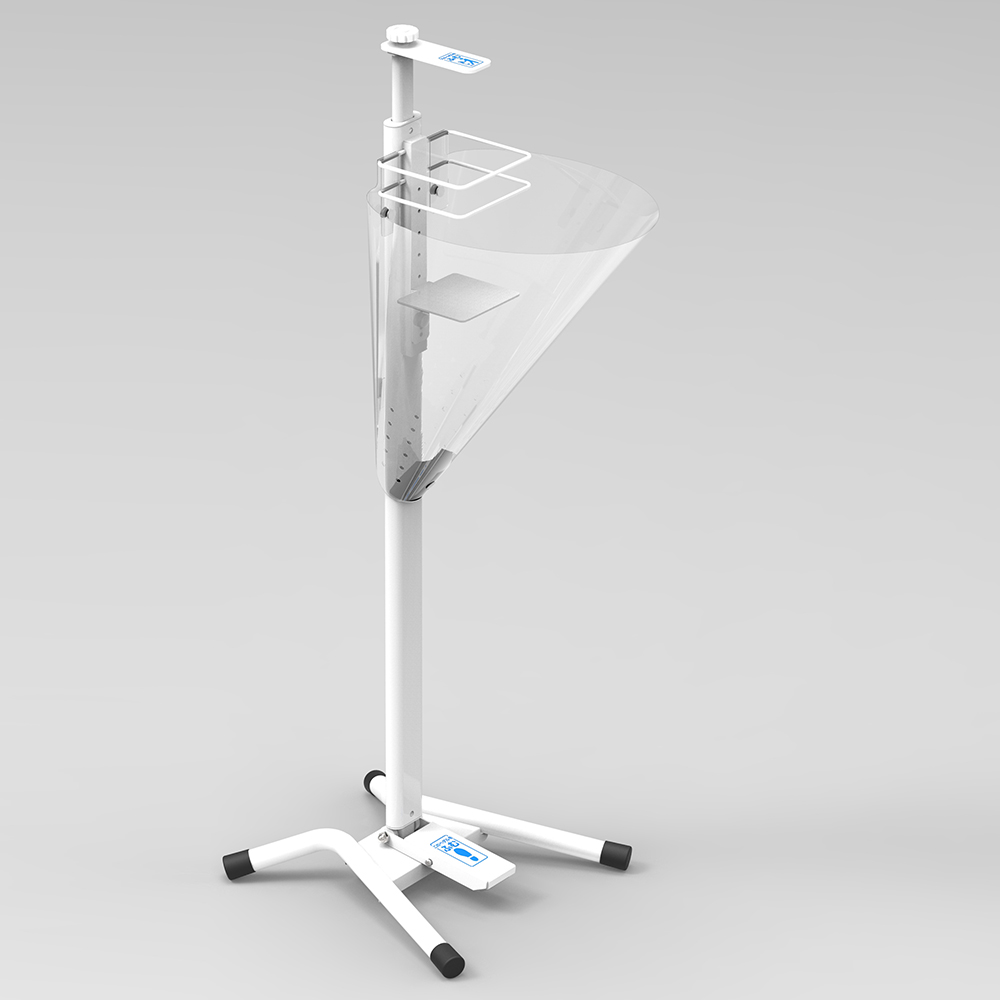 足踏み消毒ポンプスタンドに取り付けて、余分な飛散や垂れ、また、誤噴射による被服や身体への噴射液の付着を軽減します。