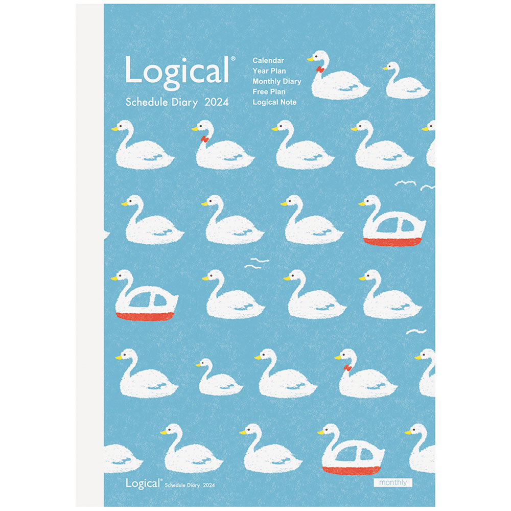 「ロジカルダイアリー」の本文は機能性ノート『スイング・ロジカルノート』と同じ本文罫“ロジカル罫”を使用しています。収録内容は年間カレンダー・イヤープラン・マンスリーダイアリーページ・フリープラン・ノートページのシンプルな構成で、マンスリーダイアリーページ(月間ブロックタイプ・日曜始まり)にはチェック項目を設けていますので、ToDoリスト形式で毎日の予定を見やすく書き込めます。