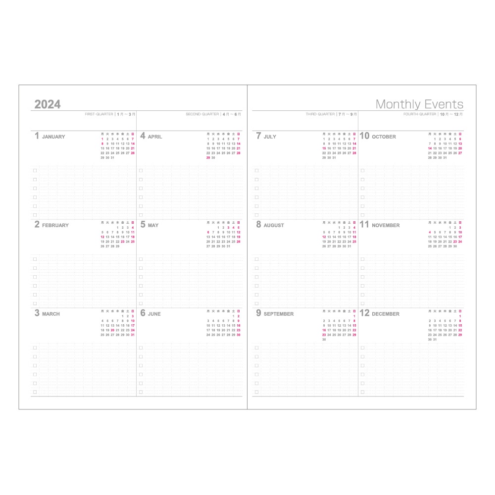 水平1週間+ノート。 月曜日始まり。ウィークリー版ロジカルノートタイプのスケジュール帳。スケジュール把握がしやすい水平配置された週間ブロックで週の予定を立てながらノートがとれます。