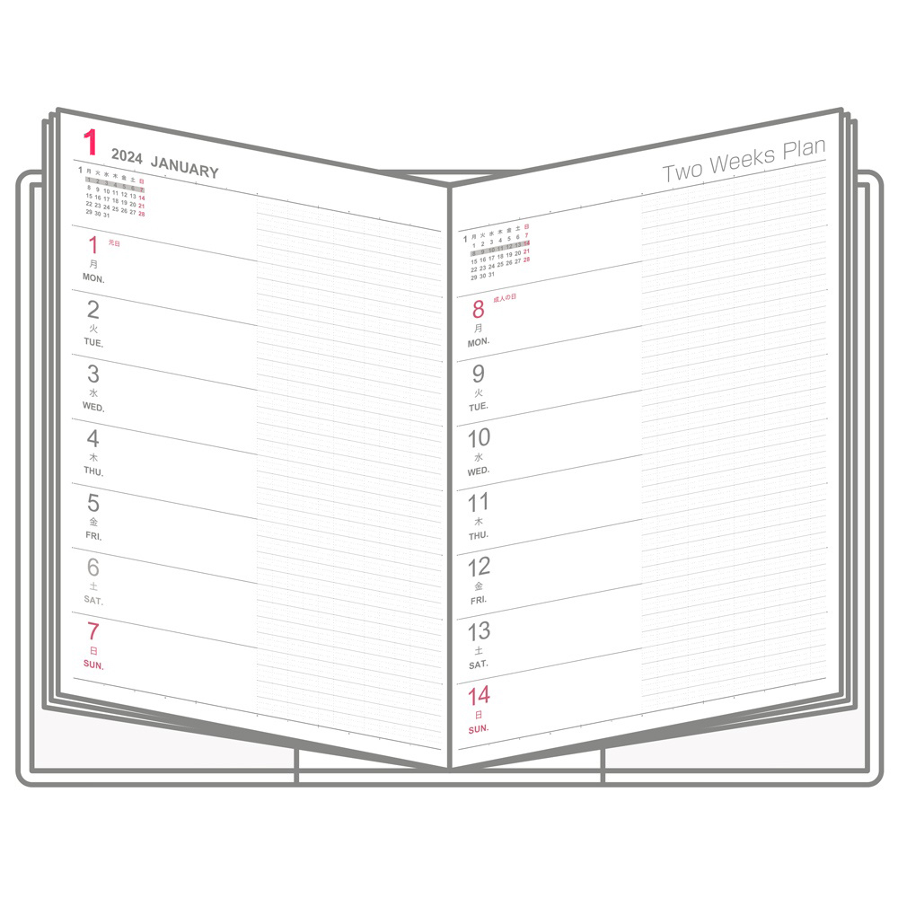スケジュールをつなげて見やすいウィークリー見開き2週間。月間ブロックタイプとつなげて使えばビジネスツールとして最適です。