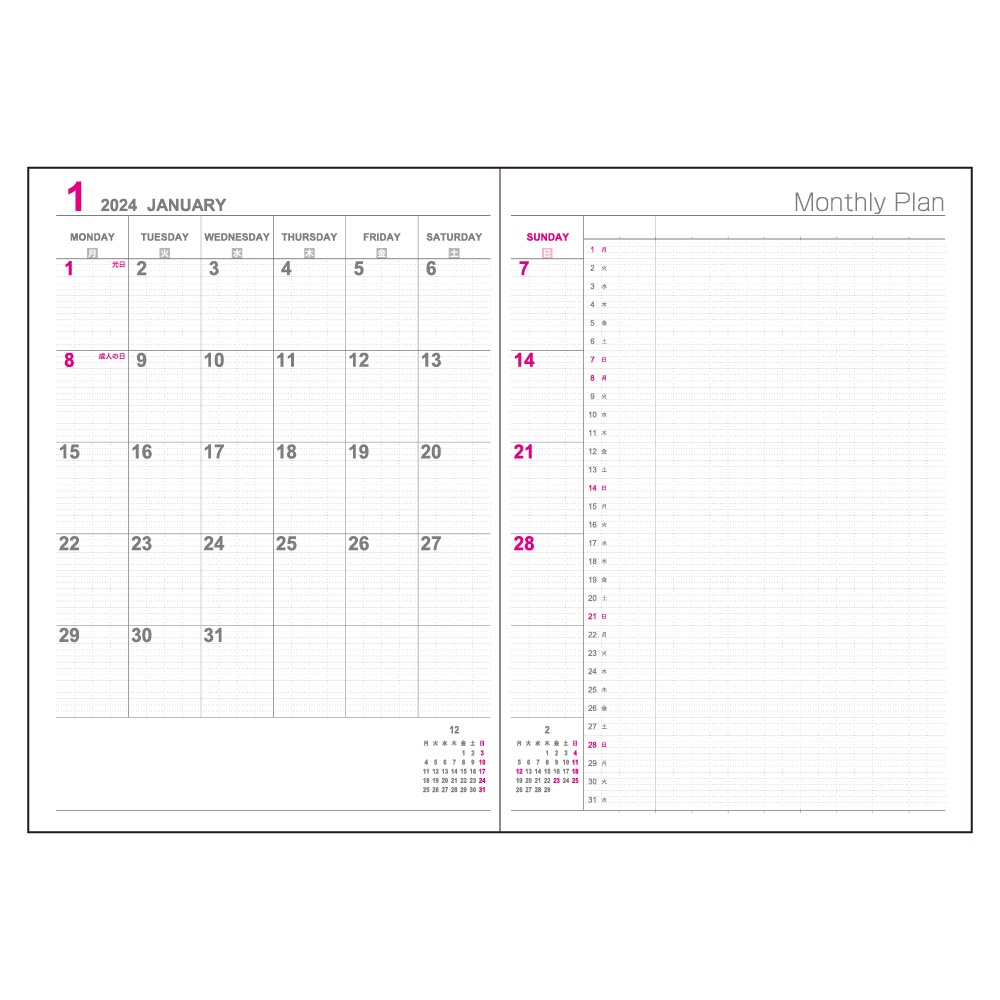 「月曜始まり」のカバー付きロジカルダイアリー。右側ノート付きの機能的な月間ページ