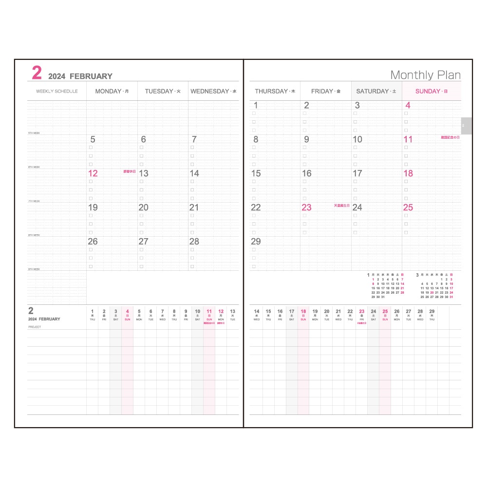 月間ブロック&ガントチャートのカバー付きロジカルダイアリー。見開き1ページで、月間ブロックとガントチャートの両方を見ることができるレイアウトです。一か月の予定を見ながらプロジェクトの進行管理ができます。サイズはスマートに携帯できるA5スリムサイズです。