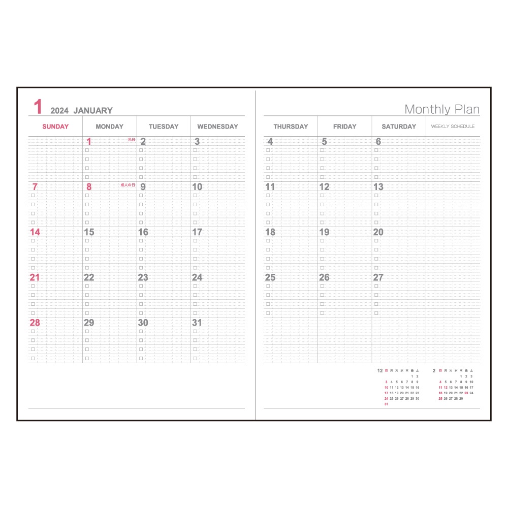 月間スケジュール(見開き1 ヶ月・ブロック式/日曜日始まり)+ノートページ充実(71ページ)
