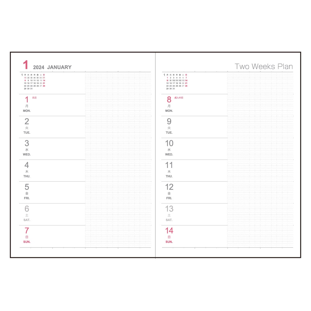 月間スケジュール(見開き1 ヶ月・ブロック式/日曜日始まり)+週間スケジュール(見開き 2 週間・リスト式/月曜日始まり)