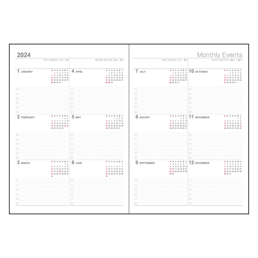 月間スケジュール(見開き1 ヶ月・ブロック式/日曜日始まり)+週間スケジュール(見開き 2 週間・リスト式/月曜日始まり)