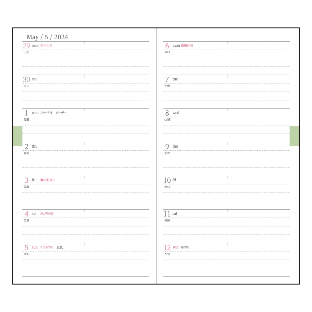 常に持ち歩きたくなるコンパクトなサイズ感の手帳。シフト表がマンスリーページにあるので便利。月曜始まり。