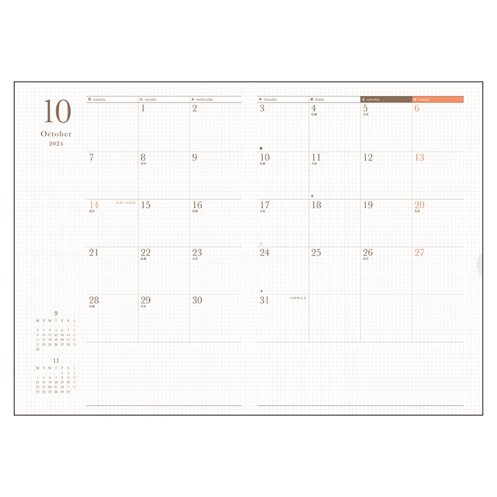 マンスリーとレフト式のウィークリーでたっぷり書ける方眼罫を採用した手帳です。