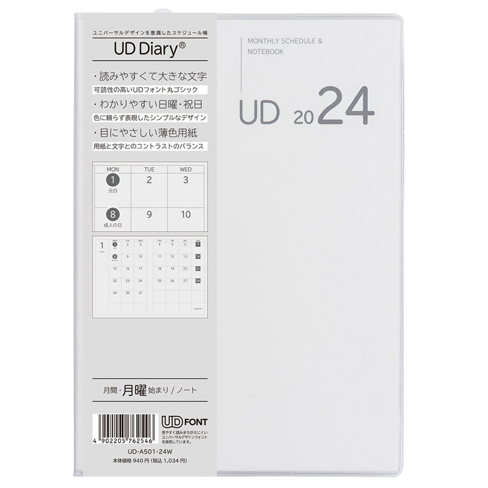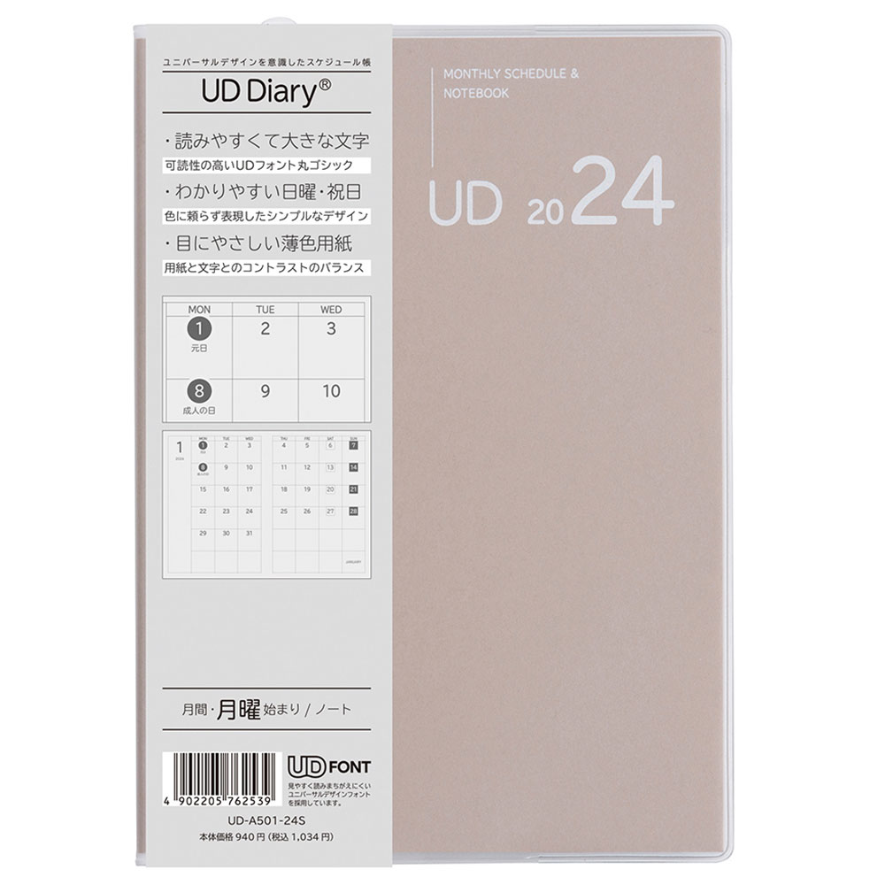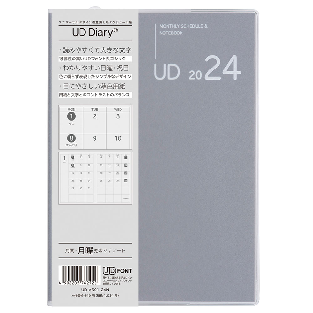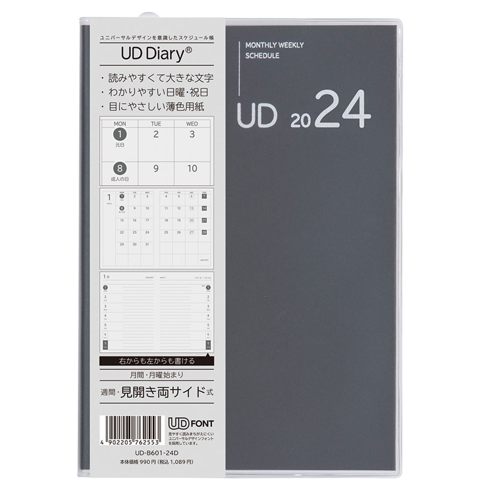 一般的に赤などで表現されることが多い日曜・祝日の表記を色に頼らず形で表現することで色覚多様性に配慮しています。人によっては区別しづらい色になりがちな赤と黒での識別方法を避け、だれもが心地のよい配色を目指し単色でのデザインになっています。