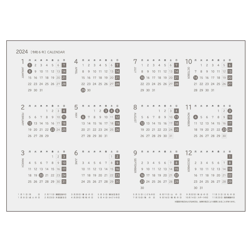 一般的に赤などで表現されることが多い日曜・祝日の表記を色に頼らず形で表現することで色覚多様性に配慮しています。人によっては区別しづらい色になりがちな赤と黒での識別方法を避け、だれもが心地のよい配色を目指し単色でのデザインになっています。