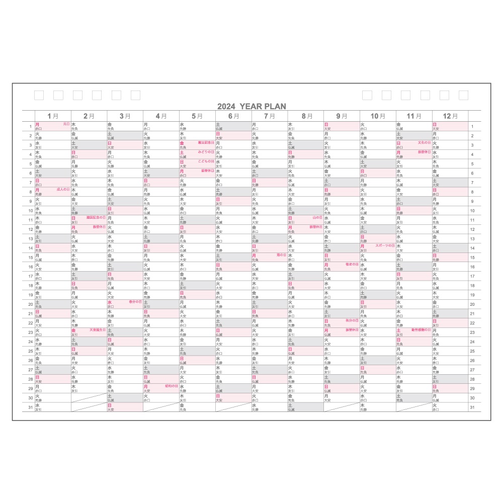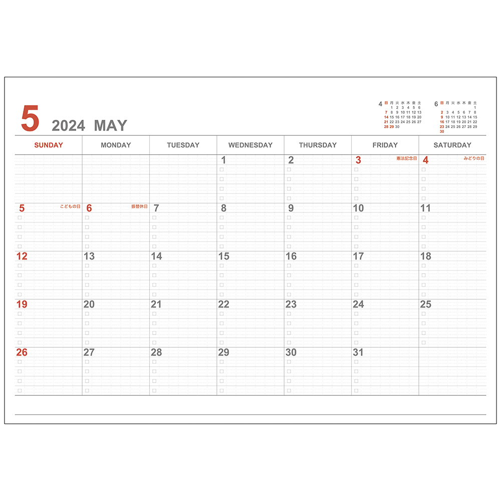 ●きれいに記入できて読みやすいロジカル罫を月間カレンダーに採用。日曜始まり。
