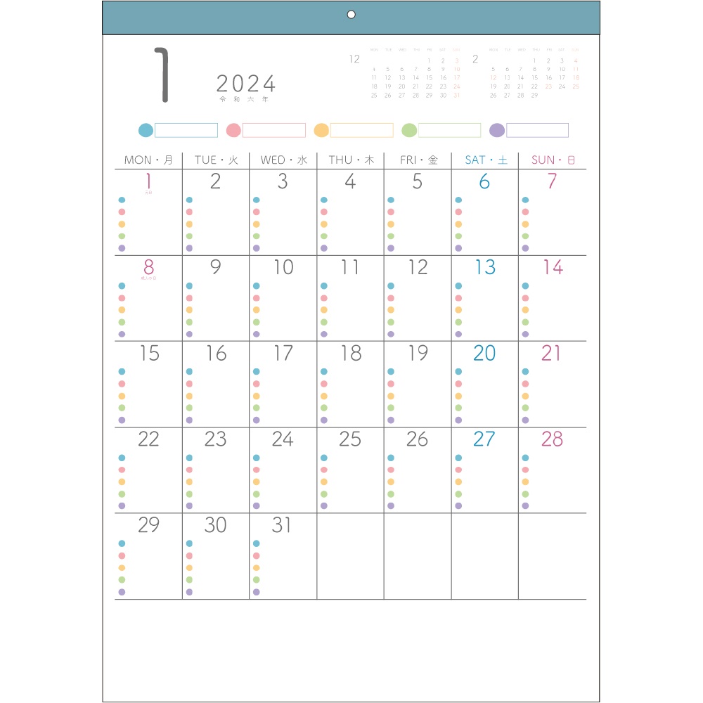 ブロックタイプのファミリーカレンダーです。5人分の予定を1ブロックに書き込めます。ファミリー需要を想定して土日を繋げた月曜始まりにしています。