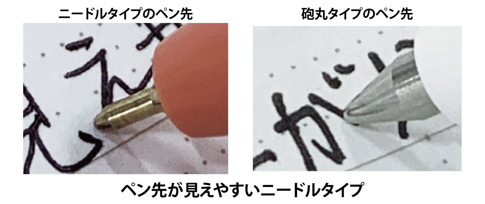 文字を記入する際にペン先が見えやすい細いペン先のニードルタイプ。