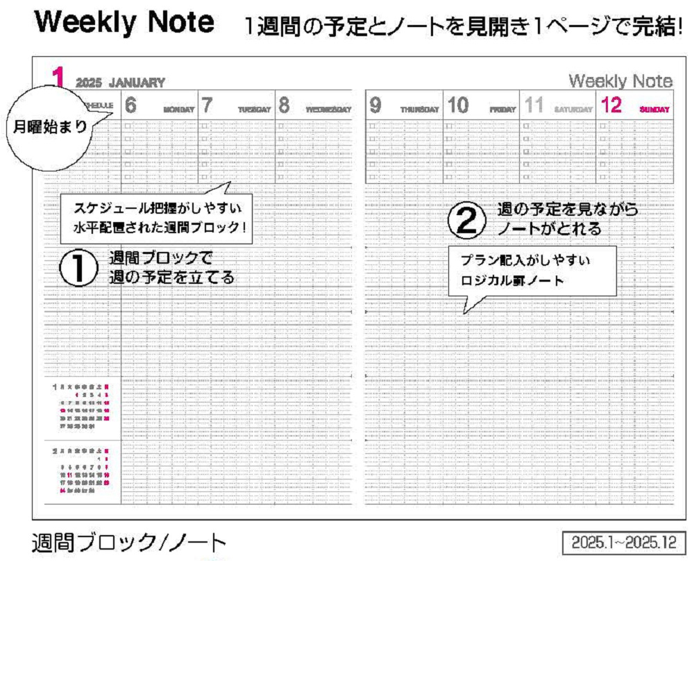 水平1週間+ノート。 月曜日始まり。ウィークリー版ロジカルノートタイプのスケジュール帳。スケジュール把握がしやすい水平配置された週間ブロックで週の予定を立てながらノートがとれます。