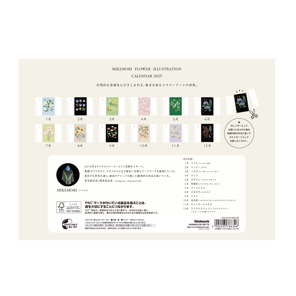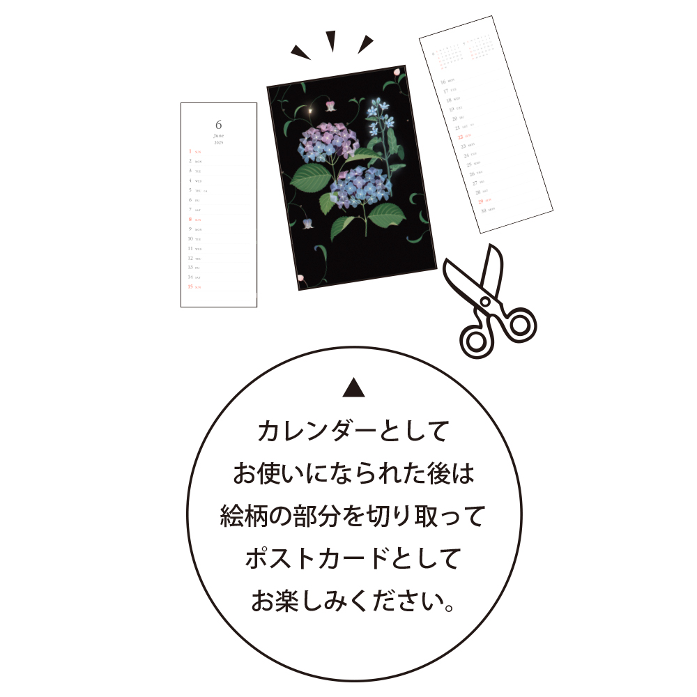 カレンダーとしてお使いになられた後は絵柄の部分を切り取ってポストカードとしてお楽しみくた゛さい。