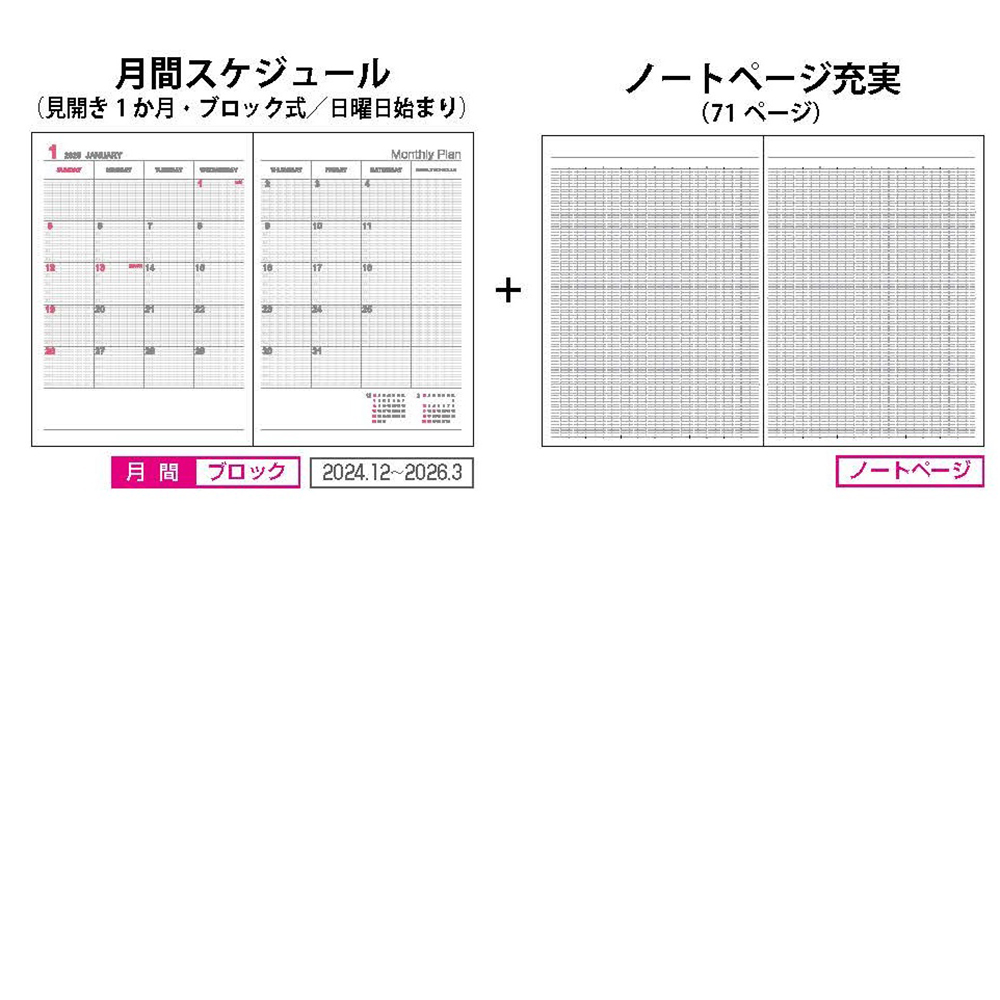 月間スケジュール(見開き1 ヶ月・ブロック式/日曜日始まり)+ノートページ充実(71ページ)