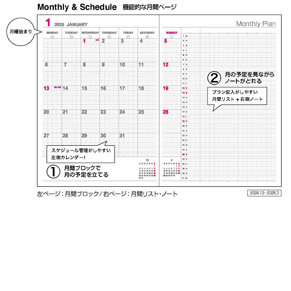 「月曜始まり」のカバー付きロジカルダイアリー。右側ノート付きの機能的な月間ページ