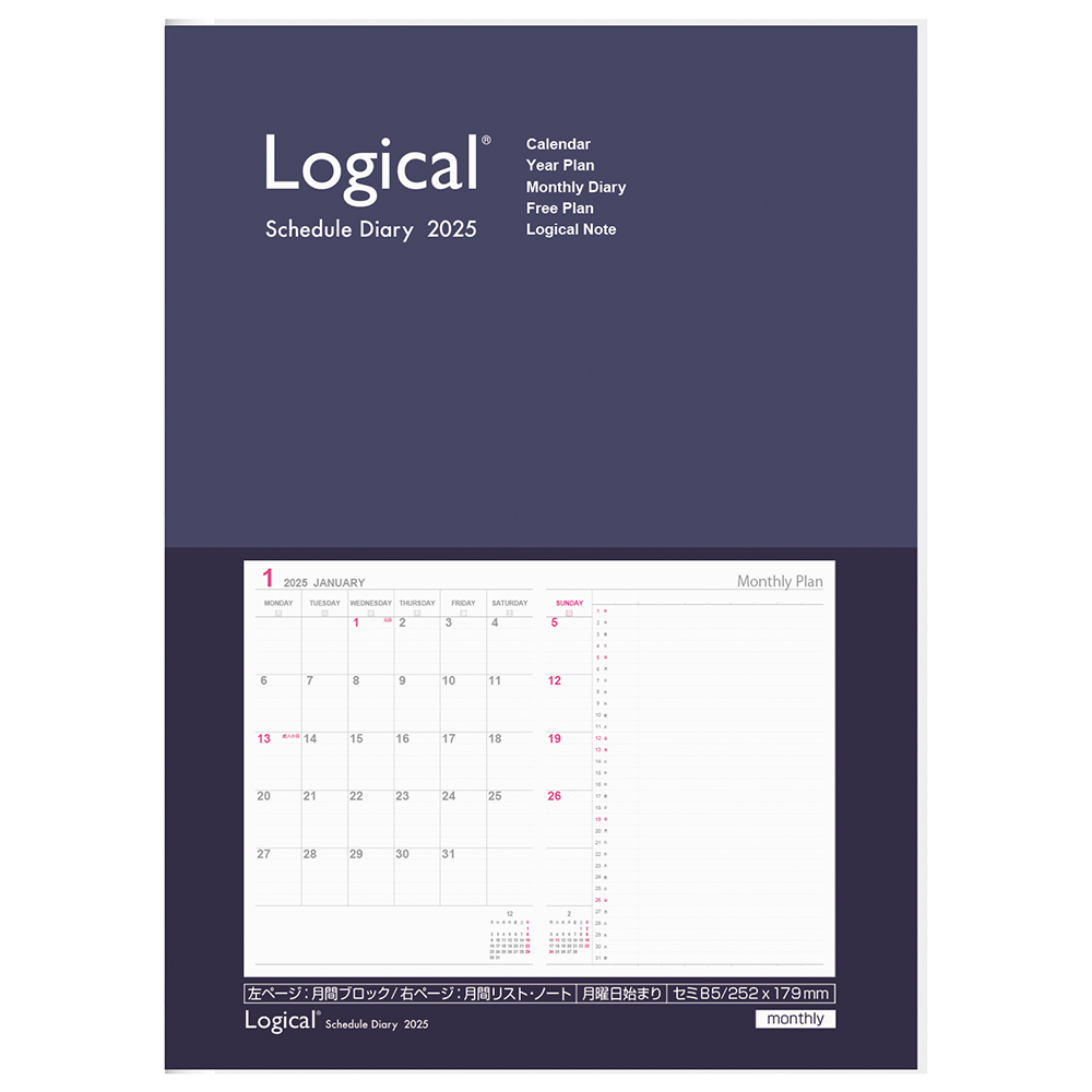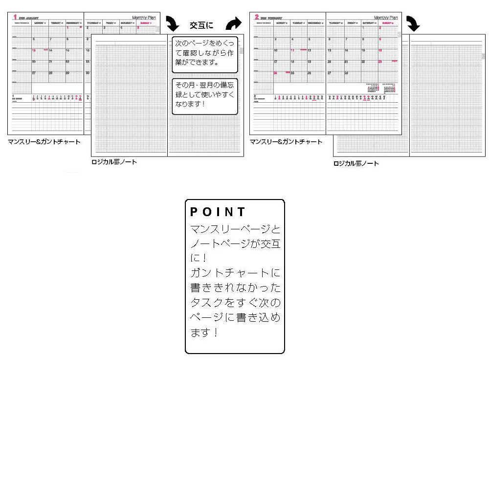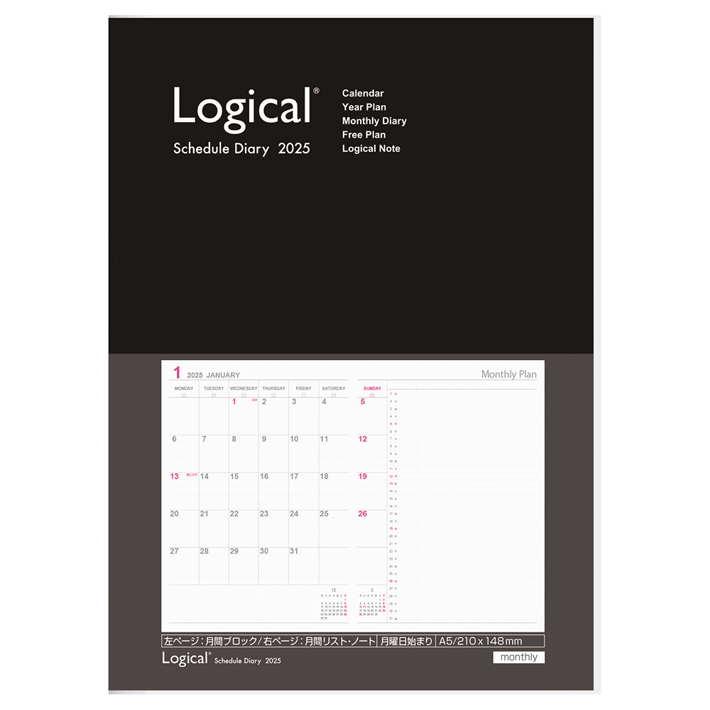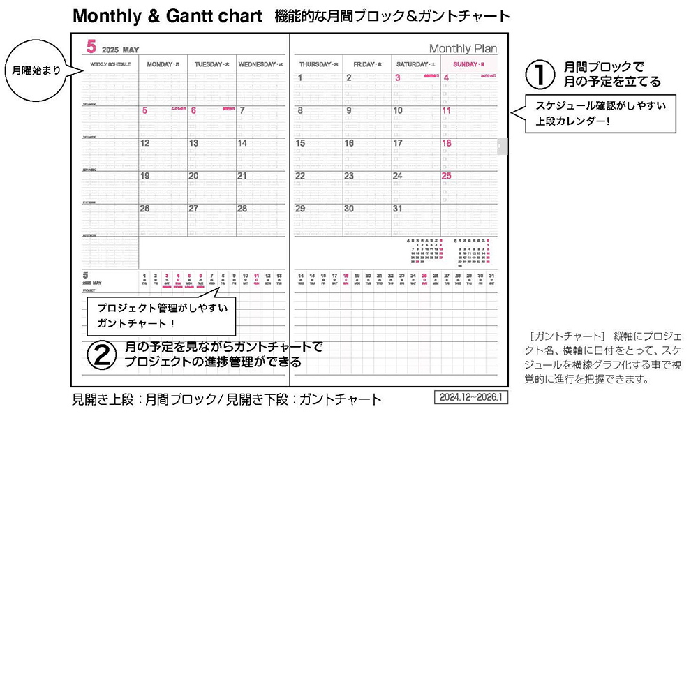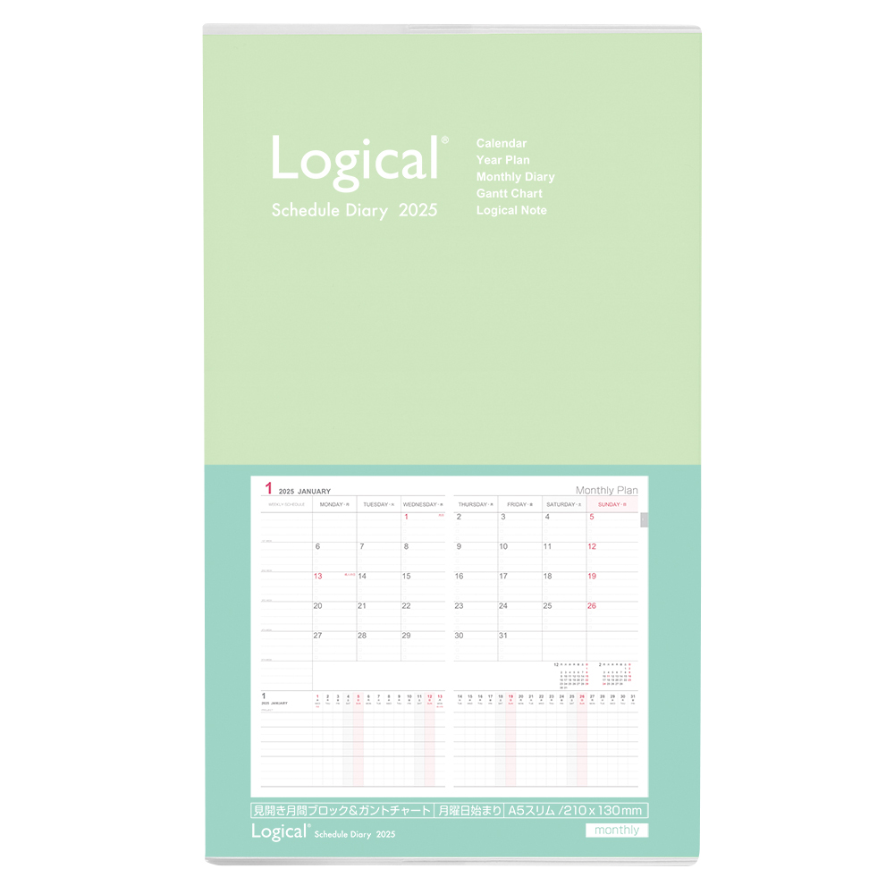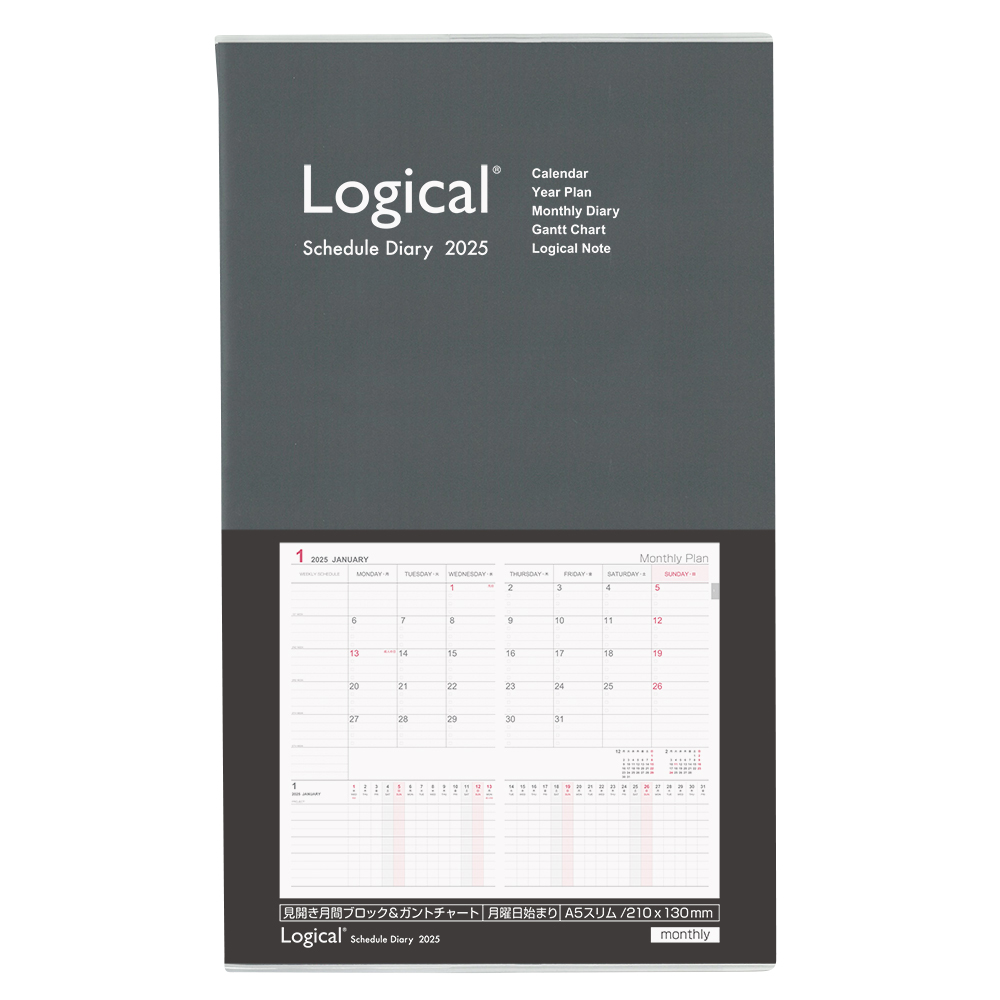 月間ブロック&ガントチャートのカバー付きロジカルダイアリー。見開き1ページで、月間ブロックとガントチャートの両方を見ることができるレイアウトです。一か月の予定を見ながらプロジェクトの進行管理ができます。サイズはスマートに携帯できるA5スリムサイズです。