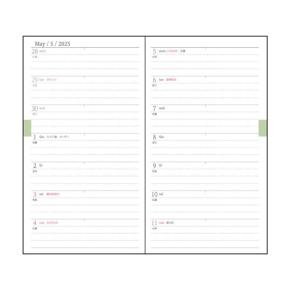 常に持ち歩きたくなるコンパクトなサイズ感の手帳。シフト表がマンスリーページにあるので便利。月曜始まり。
