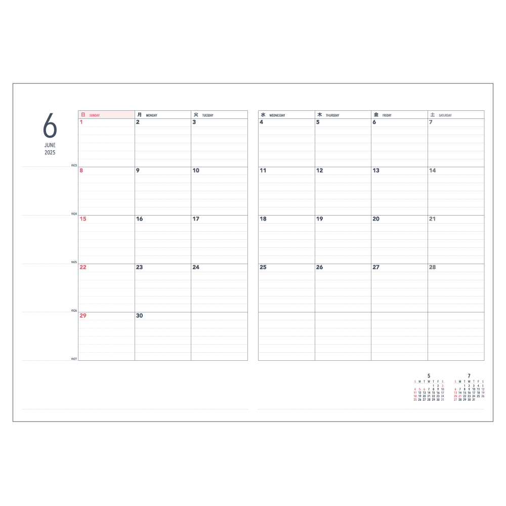 カレンダーとリンクさせるのに便利な日曜始まりタイプ。