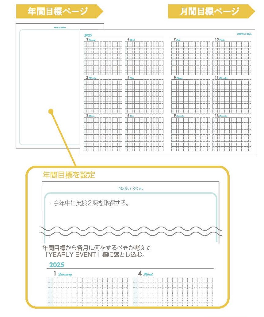 「MY GOAL」ダイアリーは、目標を達成するために段階を踏んで計画をたて、実行するための手帳です。