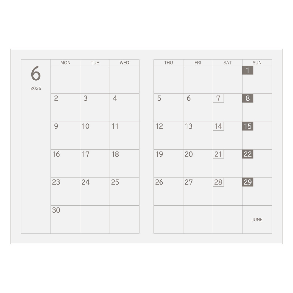 一般的に赤などで表現されることが多い日曜・祝日の表記を色に頼らず形で表現することで色覚多様性に配慮しています。人によっては区別しづらい色になりがちな赤と黒での識別方法を避け、だれもが心地のよい配色を目指し単色でのデザインになっています。