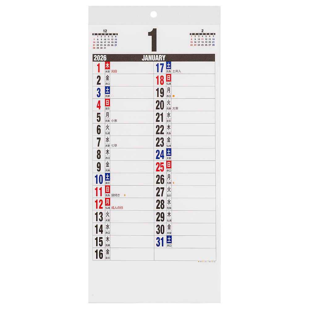 壁掛けカレンダー2026 文字月表L(リスト)タイプ/W168