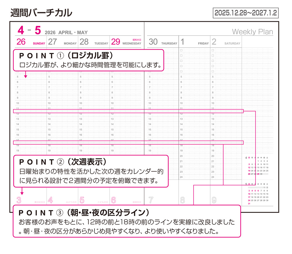 ウィークリー見開き1週間+翌週表示! カレンダーと同じ日曜始まりのバーチカル