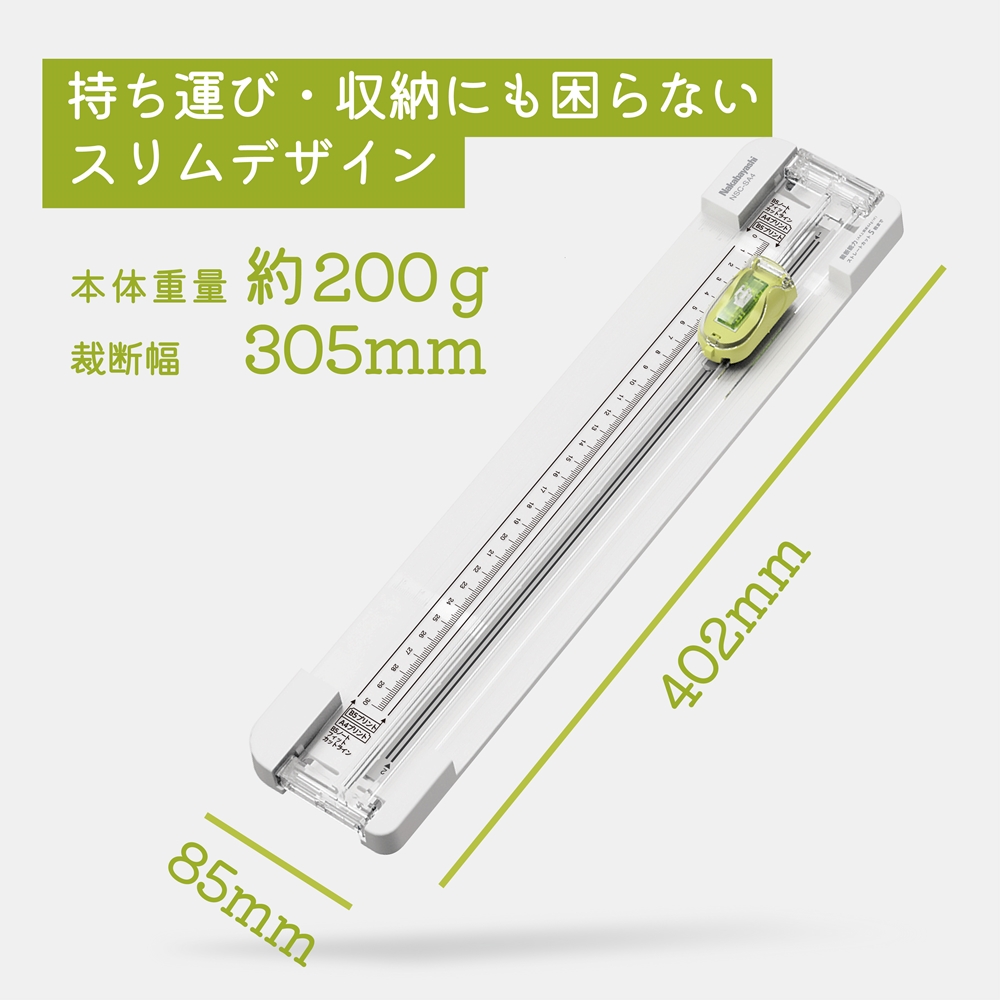 「スライドカッタースリム A4」は、従来品に比べて表面積を約30%削減したスリムなスライドカッターです。
