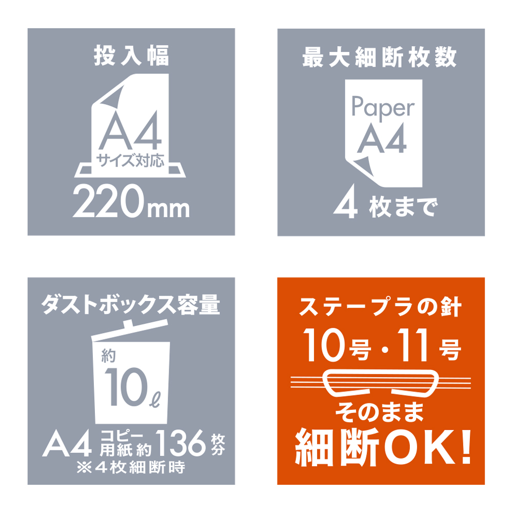 | 最大細断枚数 | 4枚(A4上質紙64g/m²)※郵便はがき/1枚(厚み0.2mmまで) |