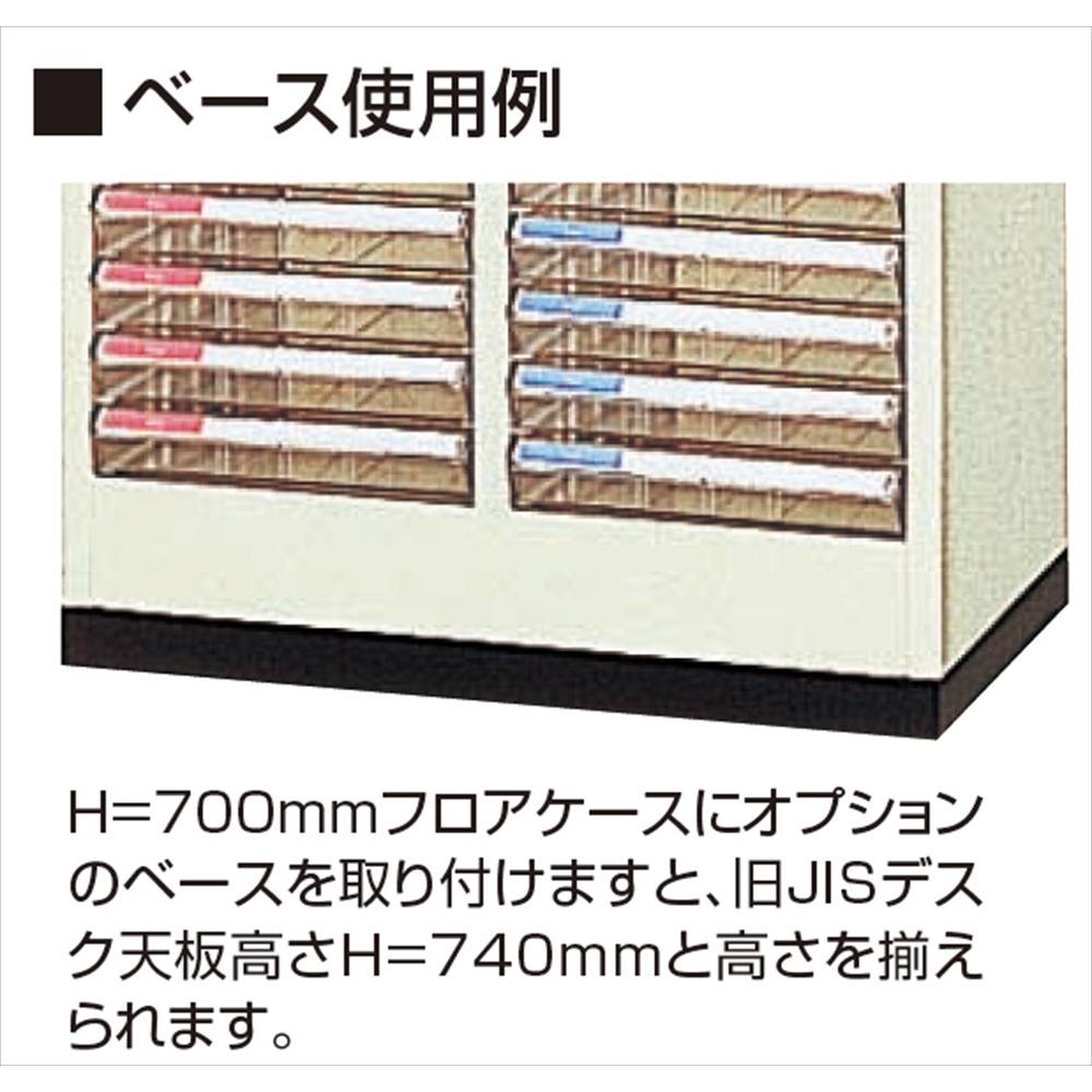 H=700mmフロアケースにオプションのベースを取付けますと、旧JISデスク天板高さH=740mmと高さを揃えられます。