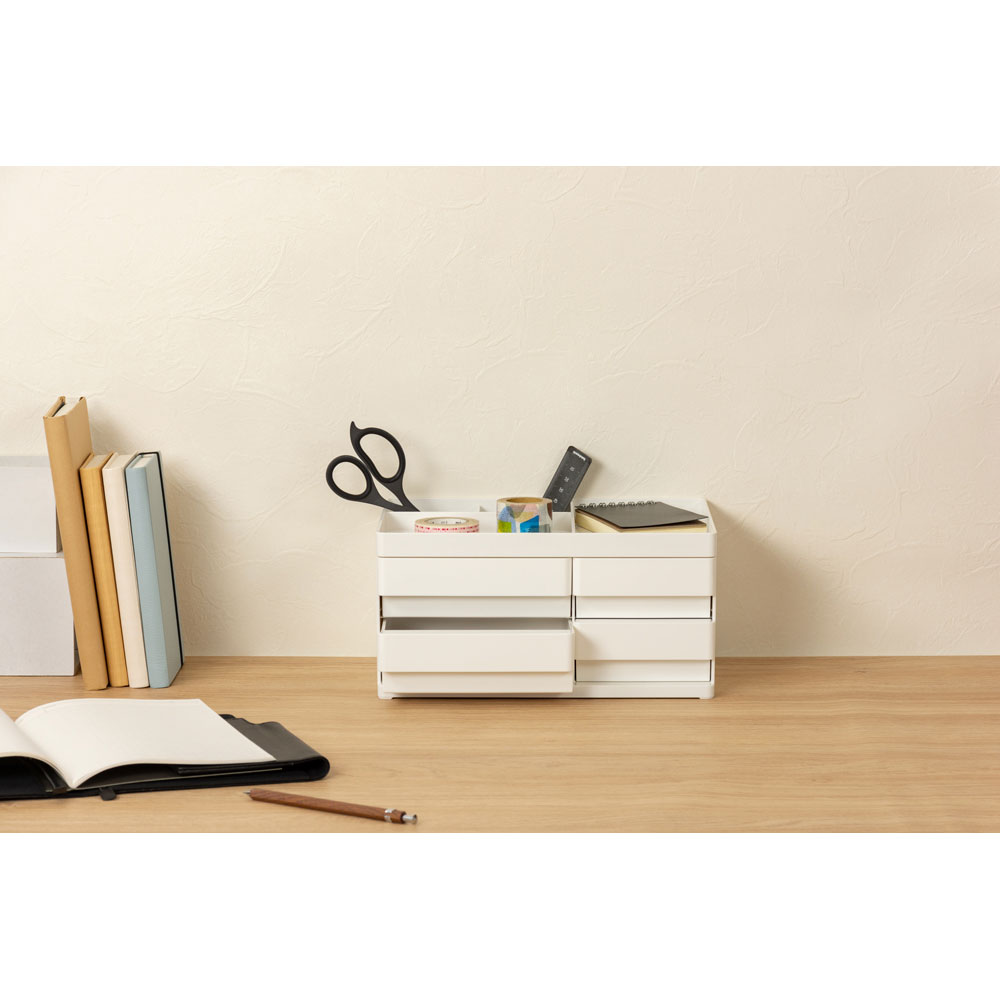 M:ペンスタンド・横長トレー×1・奥長トレー×1・横長引き出し×2・奥長引き出し×2で構成される充実サイズです。