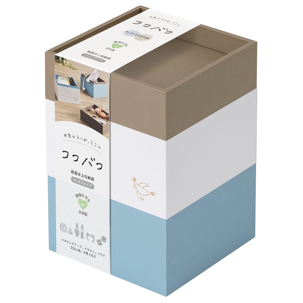 「ココバコ」は、箱を上下に重ねたり、アイテムを組み合わせたりして使いながら、収納を楽しめる紙製の卓上収納用品です。