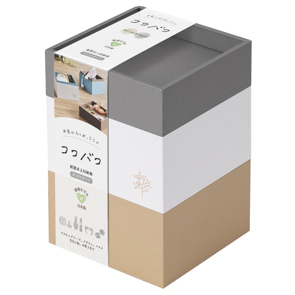 「ココバコ」は、箱を上下に重ねたり、アイテムを組み合わせたりして使いながら、収納を楽しめる紙製の卓上収納用品です。