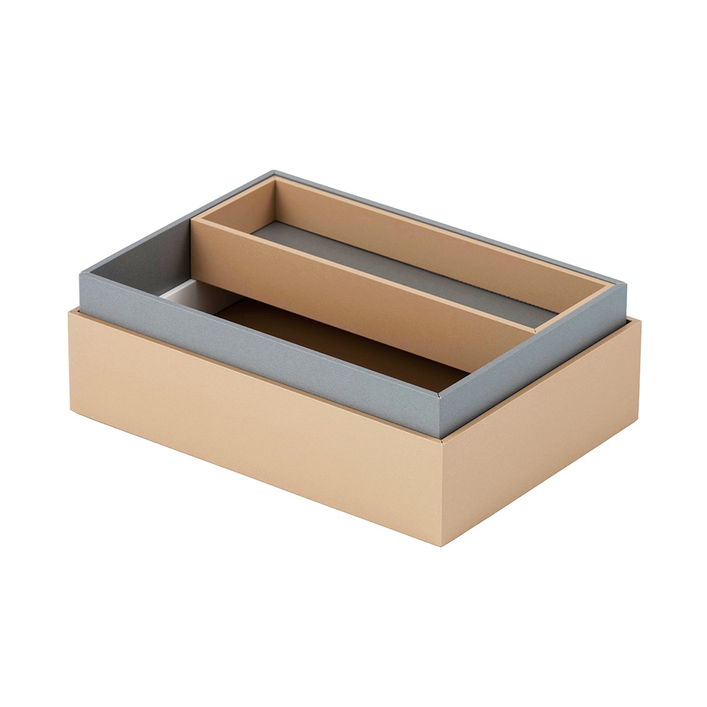箱の中に取り外しできる可動式のスライドトレーが付属し、細々とした雑貨や文具の整理に便利です。蓋の上がトレーになっているので作業中の小物置き場として活用でき、蓋の上にも箱を重ねられます。