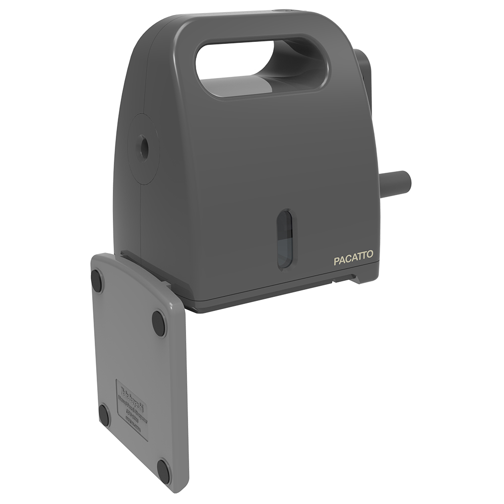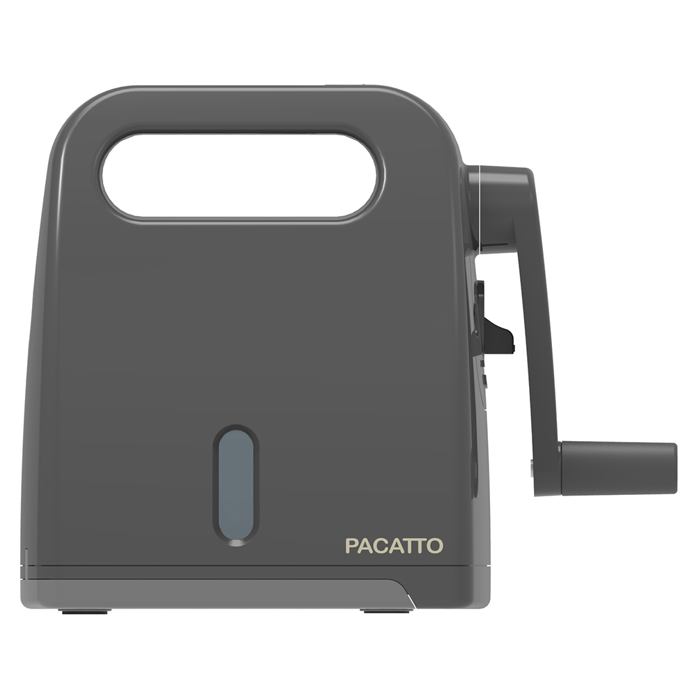 ハンドルを回すと鉛筆を引き込み、削り、反対に回すと排出する手動鉛筆削り
