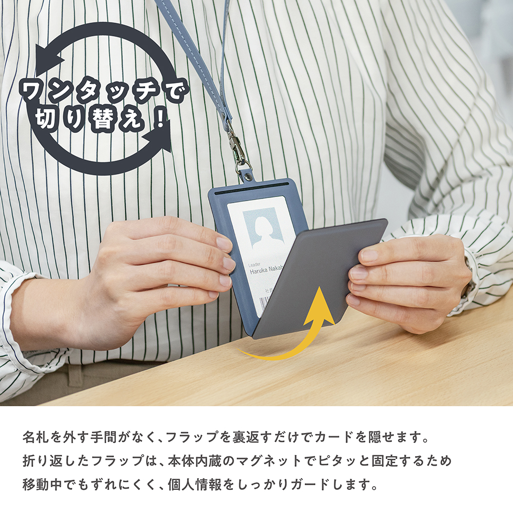 - 社内やイベント会場ではカードを表示、人目が気になる移動中や休憩時はフラップを折り返すだけでカードを隠すことができる