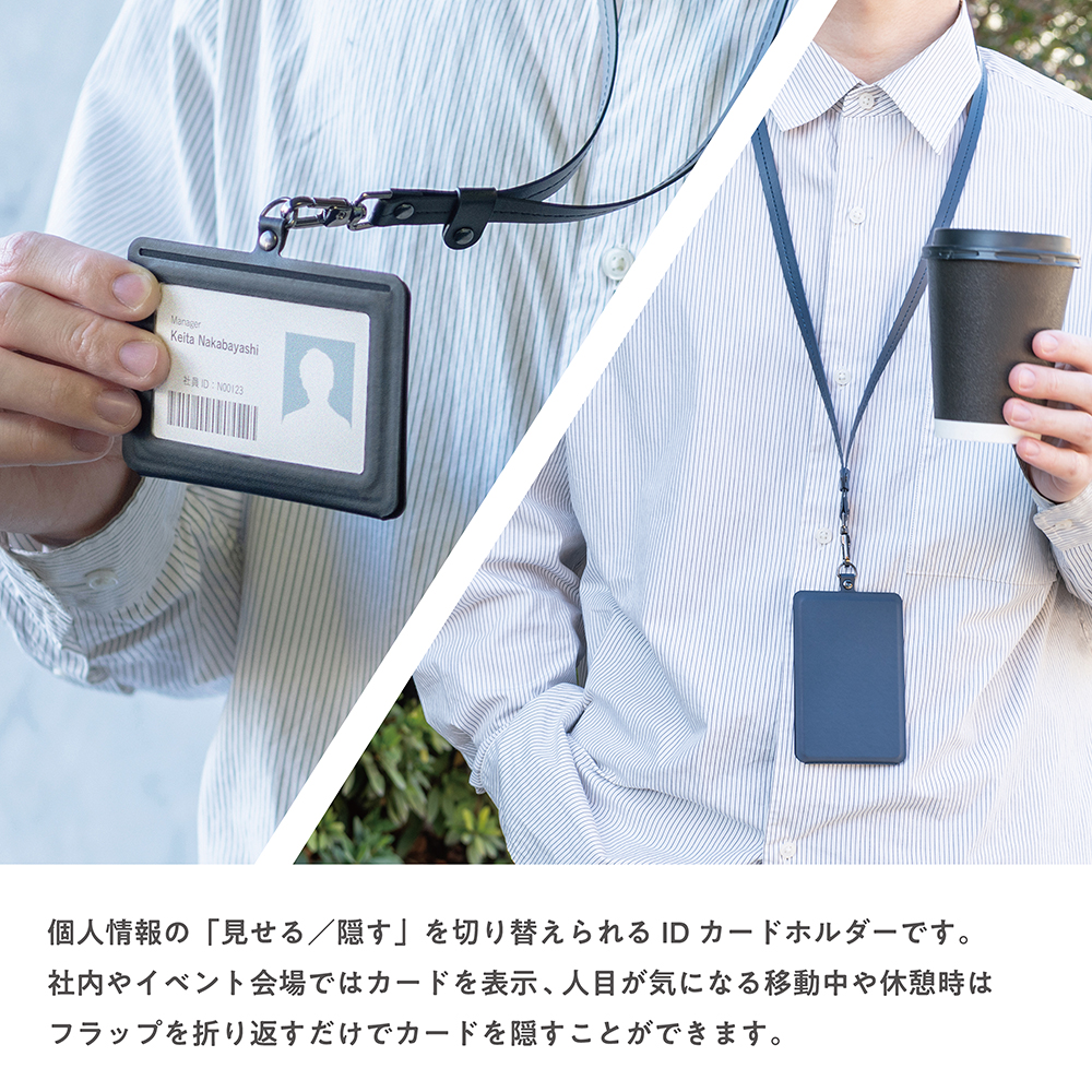 - 社内やイベント会場ではカードを表示、人目が気になる移動中や休憩時はフラップを折り返すだけでカードを隠すことができる