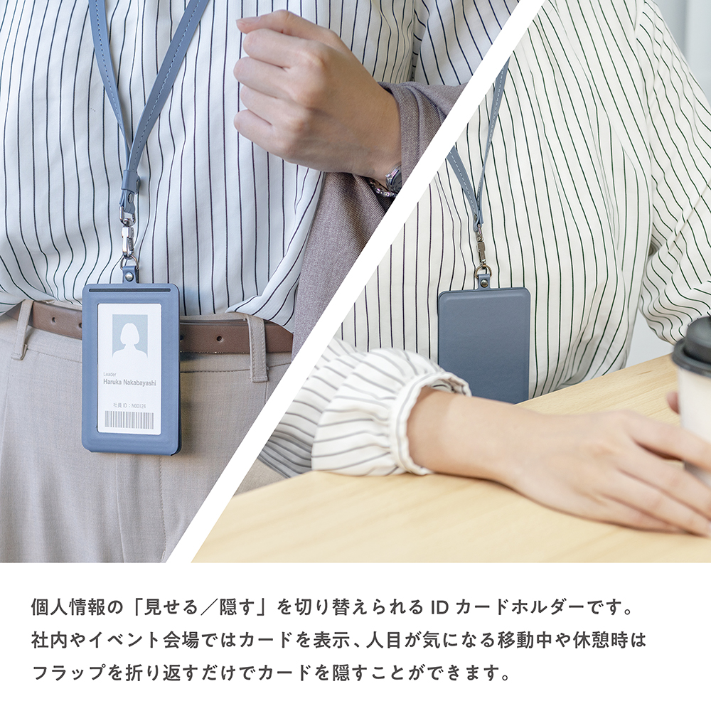 - 社内やイベント会場ではカードを表示、人目が気になる移動中や休憩時はフラップを折り返すだけでカードを隠すことができる