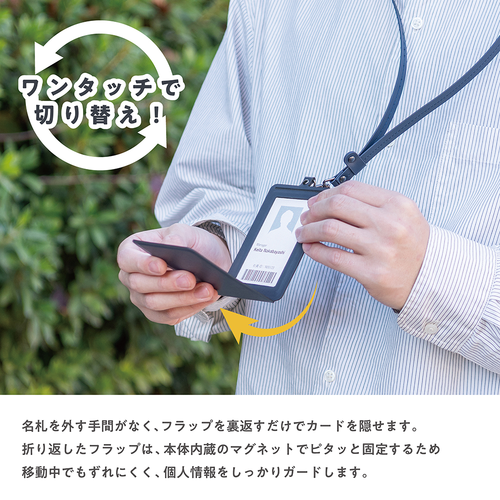 社内やイベント会場ではカードを表示、人目が気になる移動中や休憩時はフラップを折り返すだけでカードを隠すことができます。折り返したフラップは、本体内蔵のマグネットでピタッと固定するため移動中でもずれにくく、個人情報をしっかりとガードします。