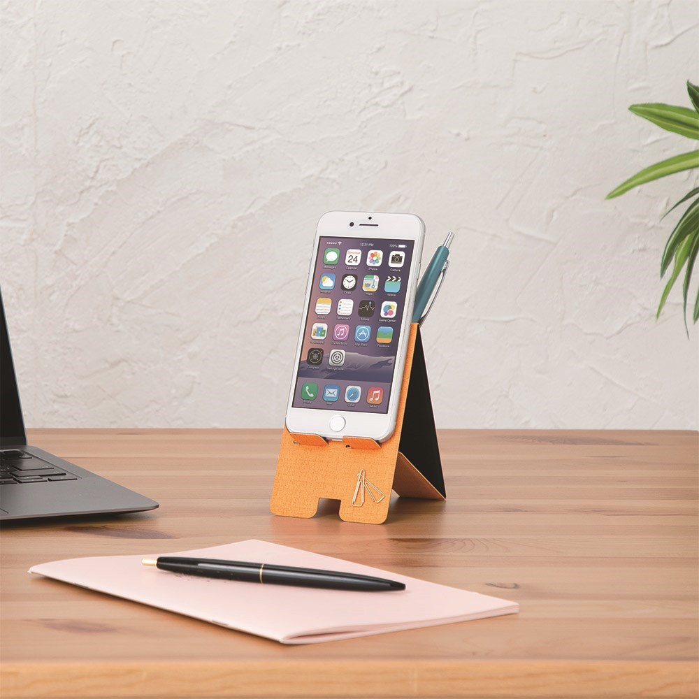 スリムな形状に折りたためるデスクオーガナイザーです。仕事で使用するスマートフォンやペンなどを見やすくひとまとめに置くことができます。