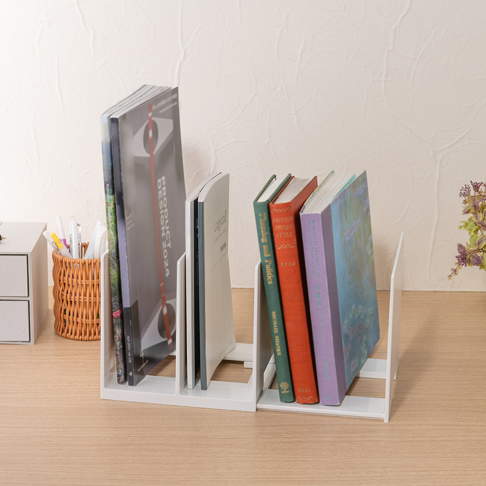 底部には凹凸の滑り止めがあり、冊数が少なくても安定して立てられます。本や雑誌はもちろんPCやキッチン用品などの整理にも便利です。