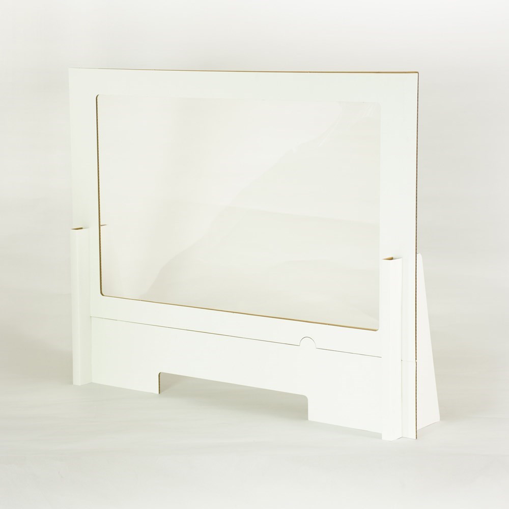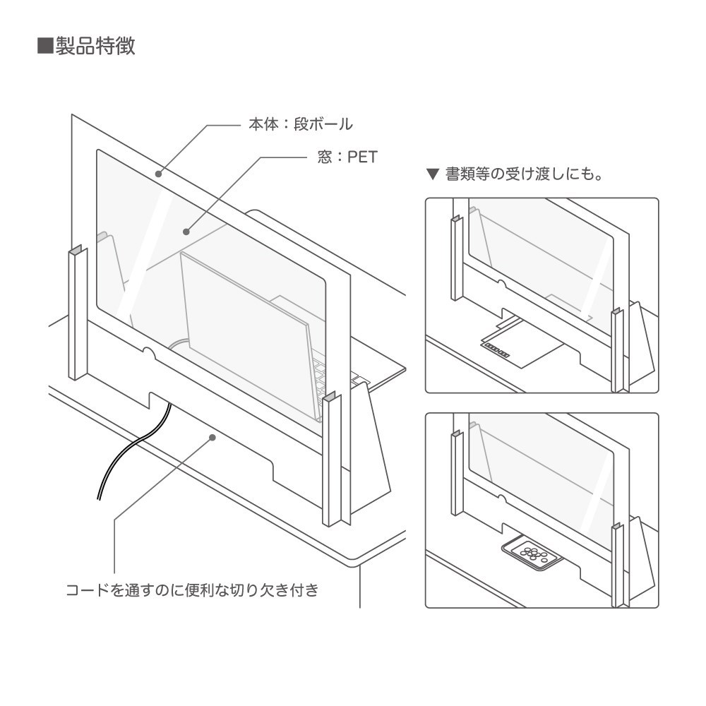 組み立てに工具を使わず、部品どうしを差し込むだけで使えるデスクトップパーティションです。オフィスやカウンター業務など飛沫飛散リスクが気になる場所に簡単に設置できます。段ボール製なので本体が軽く、設置後の微調整もスムーズに行えます。 オフィスではパソコンのコード通しとして、カウンター業務では書類などの受け渡し口として活用できる窓付き(W400×H50mm)です。 ラインアップは3台入りと10台入りの2種です。