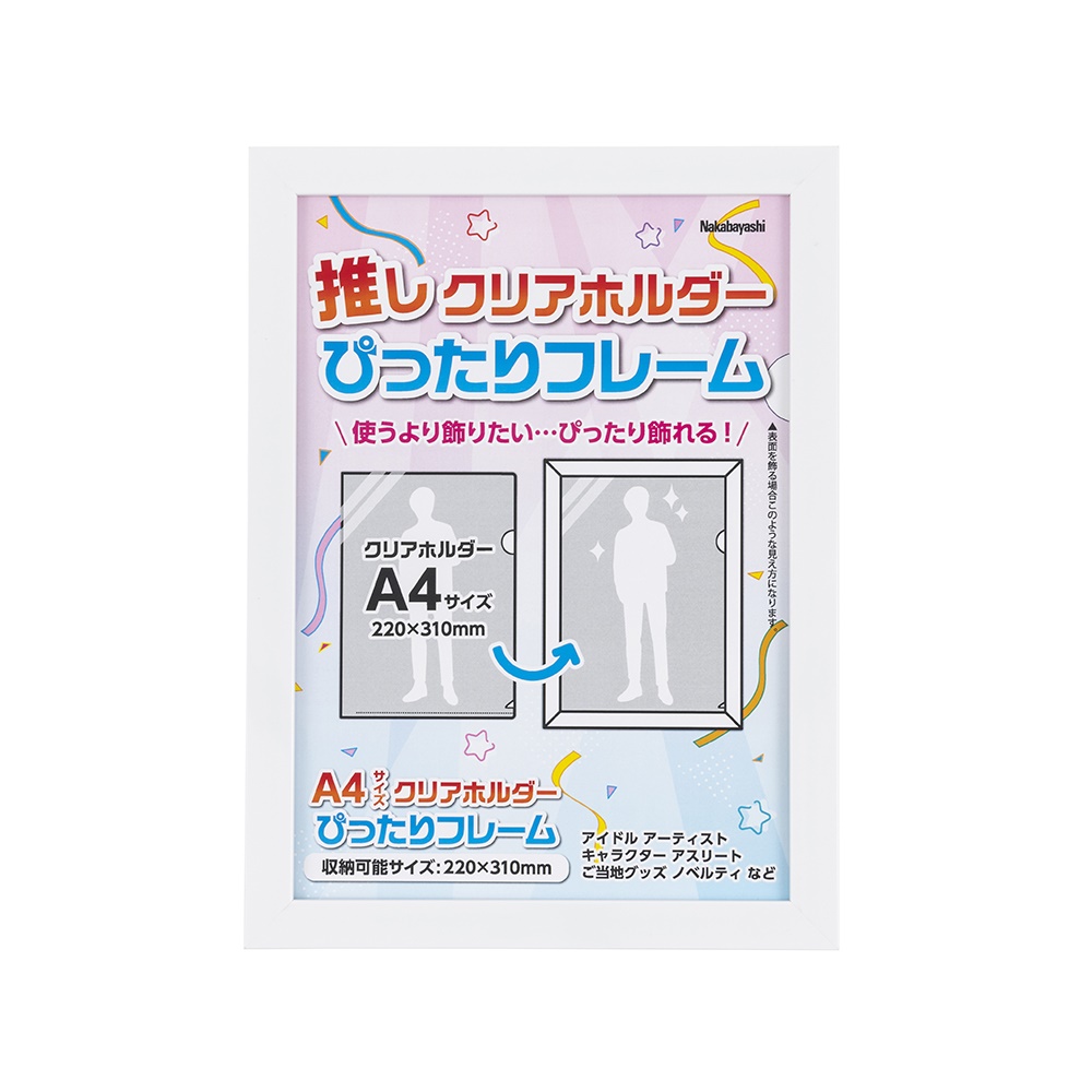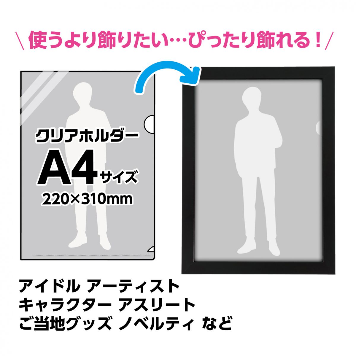 カラー展開はナチュラル・ホワイト・ブラックの3色展開。お部屋のテイストやクリアホルダーのデザインによって選べます。縦横両用スタンドと吊りヒモ・吊り金具付きのため、スタンドと壁掛け2タイプの飾り方が可能です。 クリアホルダーにデザインされた “推し※”の写真やイラストを、ポスターのように演出しながら飾れるため「推し活」に最適です。