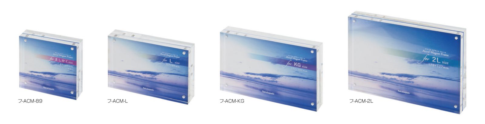 「アクリルマグネットフレーム」はプリントをマグネットで挟んで固定するアクリル製のフォトフレームです。写真向けサイズのましかく89判、L判、KG判、2L判に加え、フレーム外形寸法、収納用紙寸法をトレーディングカードやチェキなどを飾れるようにアップデートし、多様化する「推し活」のニーズに応えました。