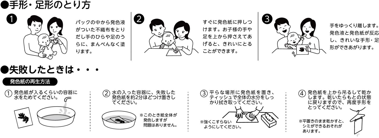 特殊な発色紙と発色液が反応することで、お子様の手足をインクで汚さずに手形や足形をとることができます。失敗しても発色紙を水洗いすることでとり直しが可能。発色紙、発色液は日本製を採用しており、発色液は化粧品等にも使われている安全性の高い成分を使用しています。