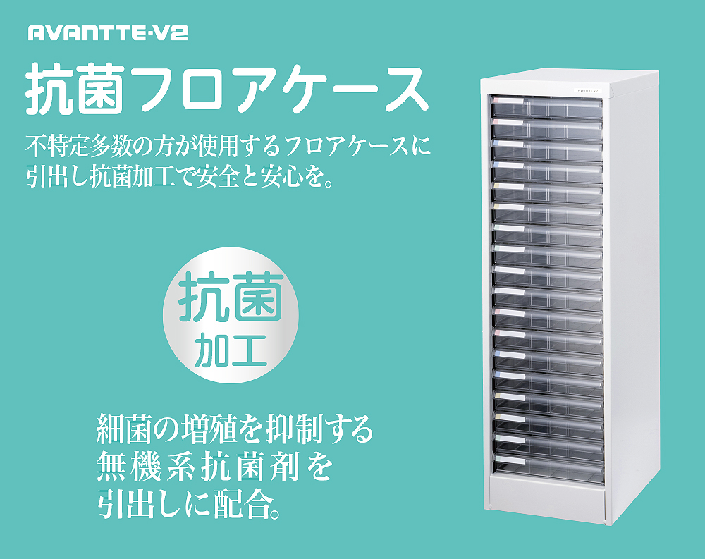 「アバンテV2抗菌フロアケース」は細菌の増殖を抑制できる無機系抗菌剤を引出し全体に配合し清潔に保つことができるフロアケースです。